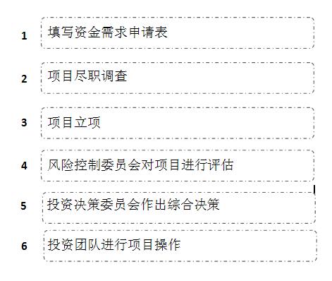 申請及項目流程:1、填寫資金需求申請表 2、項目盡職調查 3、項目立項 4、風險控制委員會對項目進行評估 5、投資決策委員會作出綜合決策 6、投資團隊進行項目操作